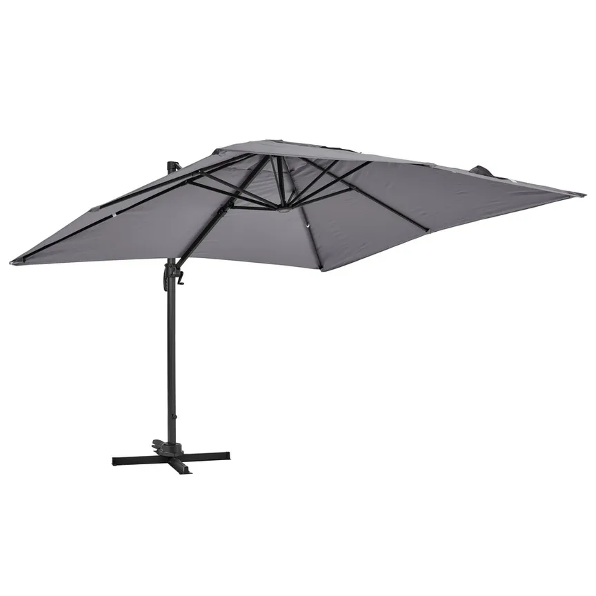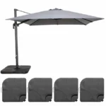 Parasol déporté carré esthétique 3×3 m, et 2,5 m de hauteur, procure une large surface de 9 m² d’ombrage, idéal pour terrasse et jardin. Ce parasol excentré est très solide grâce à son mât principal de 77mmx53mm de diamètre et son mât déporté 26mmx45mm maintenu par 8 baleines. Ce parasol de jardin est très résistant grâce à sa structure 100 % en aluminium et sa toile 100 % polyester 250 g/m². Cette toile de parasol dispose d’un traitement anti UV, est déperlante et teintée dans la masse pour éviter toute décoloration… Inclus un lot de 4 dalles à lester.